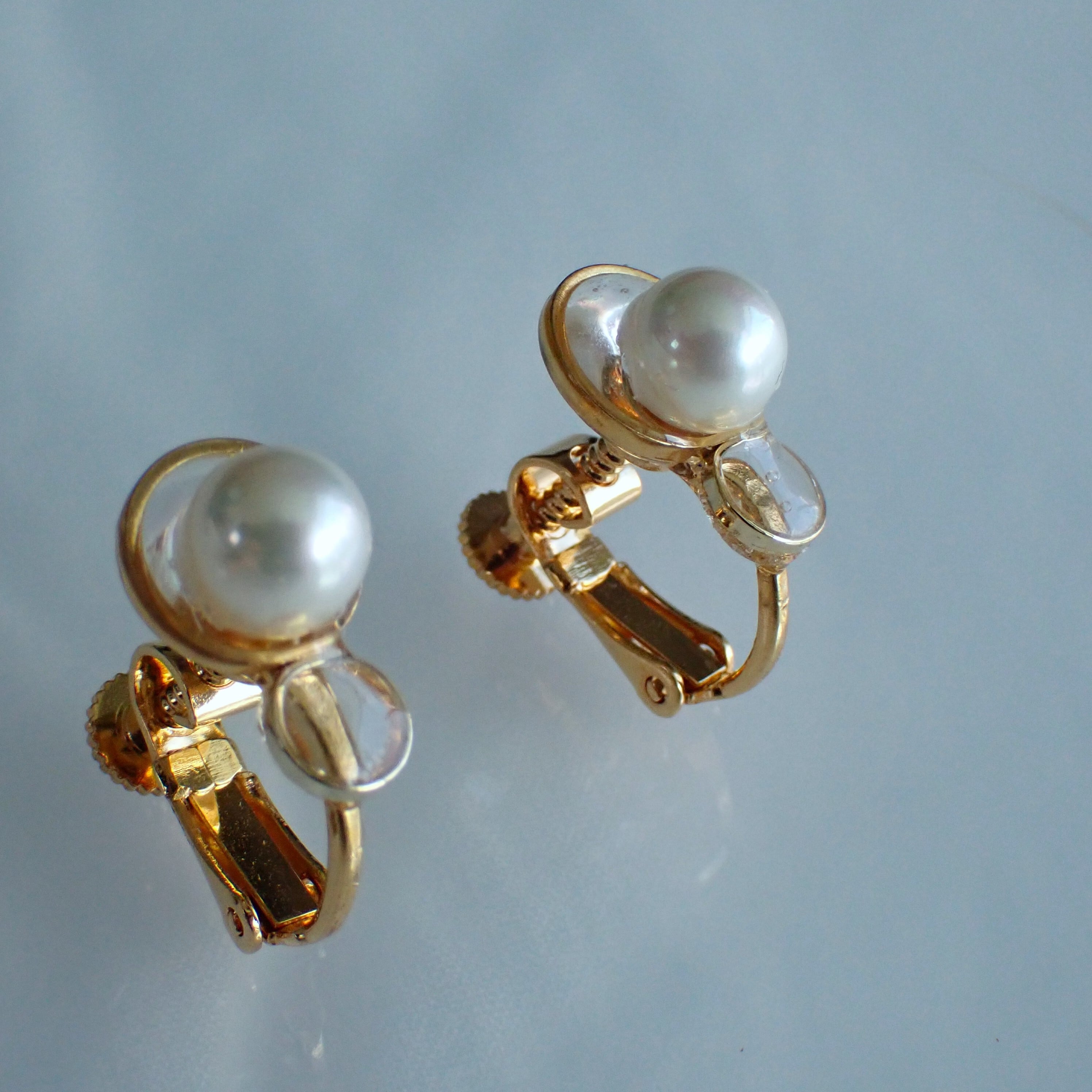 ミガキパールの上質な光沢と、それを取り囲む透明な素材が更に光をすいこみ、小ぶりながらも明るさを集める存在となる。